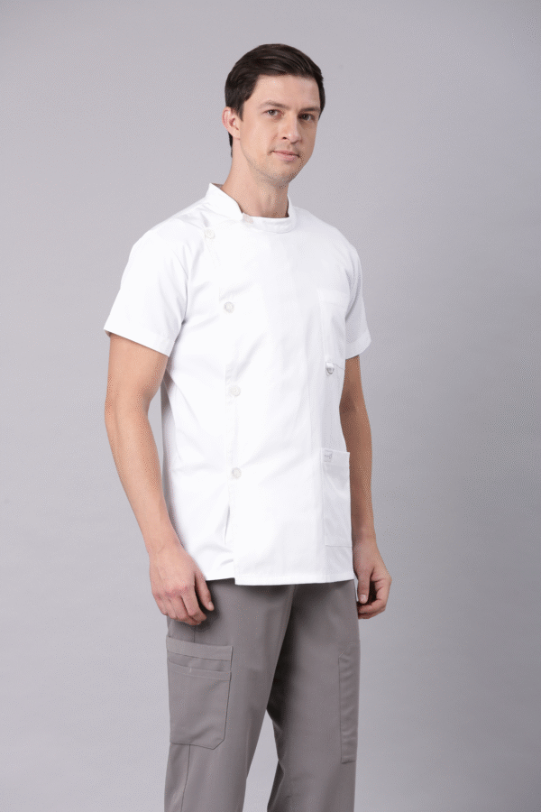 Original price was: ₹830.00.₹664.00Current price is: ₹664.00.The unisex easy-care poly/cotton half-sleeve lab coat is designed for comfort and durability—perfect for dental professionals. It features a sleek V-neck design with a front chest pocket and bartacked pencil slot for added utility. Side vents ensure ease of movement throughout your busy day. The PROTECT U Everyday Signature lab coat is fade and wrinkle-resistant, branded with the signature PROTECT U logo twill tape at the back neck and a logo label on the left sleeve.
