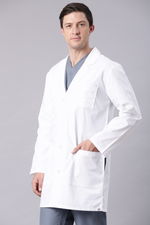 Premium Plus Men’s Full Sleeve Lab Coat, designed for professionals who value both function and style.✅ Professional Design: Classic full-sleeve lab coat with a structured collar and front button closure for a smart, clinical look.